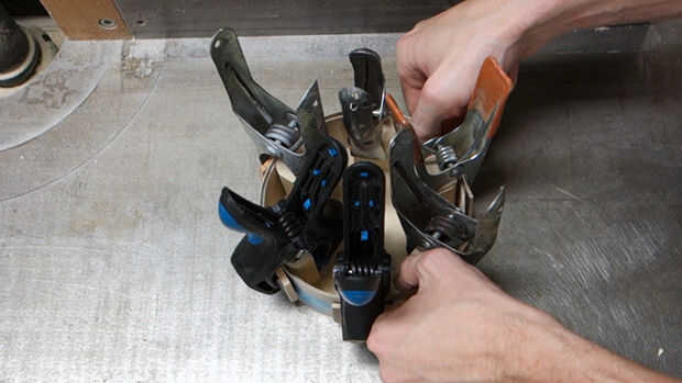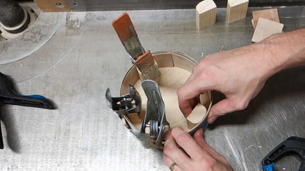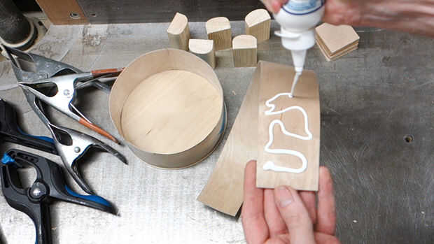 Añadir una cobertura abundante y uniforme de pegamento sobre el listón y lo dejó dentro de la kalimba. Algunos bloques de encolado con caras redondeadas se hicieron no para ejercer cualquier presión desigual en cualquier punto de la kalimba, algo que podría resultar en deformaciones de la madera.