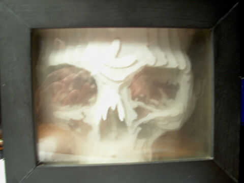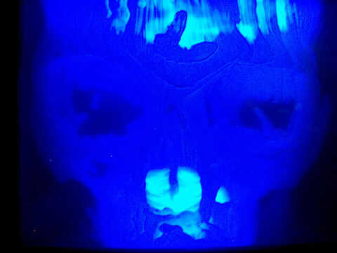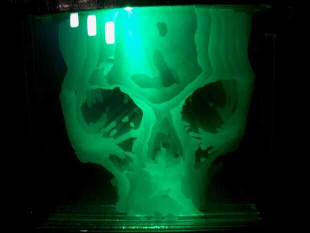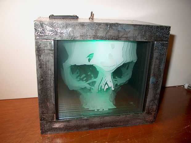 Después mi esposa tenía algunas pruebas médicas (todo estaba OK!) ella fue enviada a casa con el conjunto de imágenes de MRI. Me di cuenta que podía usar las 'rodajas' cráneo de mi esposa para crear un modelo 3D. Después de la experimentación un poco, incluyendo un modelo de cartón pluma descuidado y un flipbook, decidí pintar cada capa en una hoja de acetato y apilarlas en una caja con retroiluminación LED. Aquí vemos que la lámpara original con luces azules y el otro en verde que describiré en este instructable.