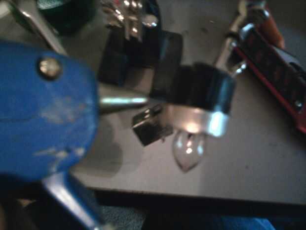 Encolado el anillo metálico en la parte superior del portalámparas, luego Dale la vuelta y pegar a la botella para que el foco apunta hacia abajo (ver foto).