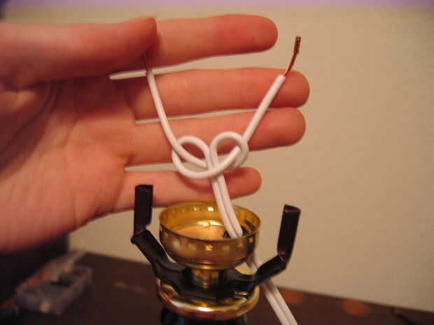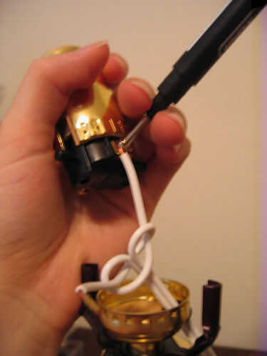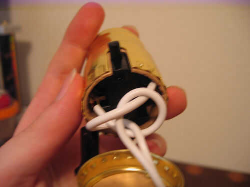 Coloque la tapa de la base y el zócalo de arpa en la varilla roscada y, apriete la tapa del zócalo con su destornillador. A continuación, enrosque el cable eléctrico a través del agujero en la tapa y un nudo "del suscriptor." (Ver imagen). Envuelva los extremos pelados de su alambre alrededor de los tornillos terminales del zócalo y apriete hacia abajo. Luego deslice la cáscara de encaje forrado de papel hacia abajo sobre toda la cosa y clip el ensamble en la tapa del zócalo. Hay pequeños dientes que traben en ranuras de la tapa, así que solo rock y hacia atrás hasta que haga clic y es constante.