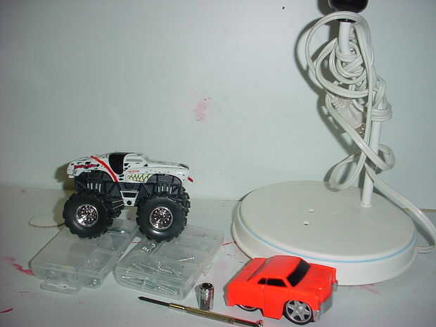 La base no era exactamente lo que estaba buscando, pero que podría funcionar. Entonces encontré un par de juguetes que encajarían en mi base, se reunieron varias tornillos y tuercas y herramientas pequeñas y por supuesto mi cámara!