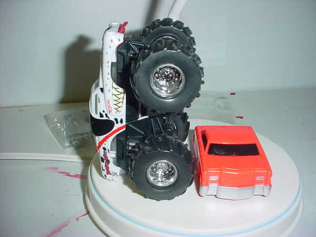 La pieza acabada todavía tiene movimiento y un joven puede pop una rotación y "aplastar" el coche, totalmente imprevisto pero un bono bonito!  No estoy seguro que si la cortina va a ser la encarnación final, tengo en mente decopageing algunas fotos del local Monster Jam con los camiones vuelan por el aire... pero que tendrá que ser otro "ible"