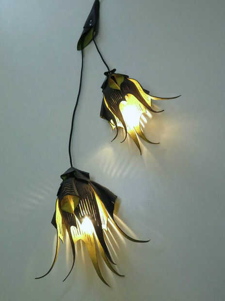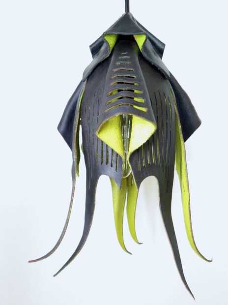 Yo he estado experimentando mucho con cuero escultura y quise probar usando esta técnica para hacer una pantalla de cuero. Tomando verduras de piel curtida (sin terminar) en agua lo convierte en una casi arcilla-como sustancia que puede ser esculpida fácilmente a mano y mantiene su forma después de que se seque. Combinado esta técnica con corte con láser para crear un conjunto de lámparas colgantes con un orgánico, como la flor, la forma.