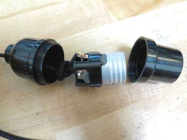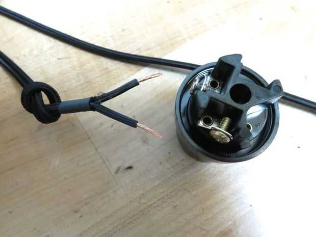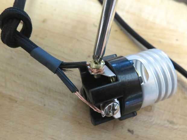 Luego corte la cubierta del paño en el extremo de cada cuerda, dividido y había despojado de los dos extremos del alambre. I aflojar los dos tornillos en el interior de los accesorios del zócalo, envuelve los extremos desnudos de los cables alrededor de la base de los tornillos y apretar hacia abajo otra vez. Entonces atornilladas las viviendas toma detrás.