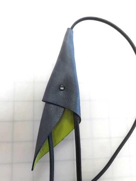 Quería cubrir la Y en el alambre con algo que no sea sólo del encogimiento del calor, así que creado una cubierta de cuero simple, que he teñido y Unidas con remaches. Esto también ayudó a mantener las dos ramas del cable aparte un poco, haciendo que las flores cuelgan más suavemente.