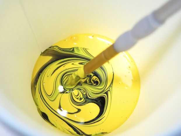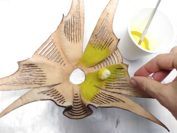 Para crear un bonito color amarillo verdoso para el interior de las flores había mezclado un poquito del negro Waterstain en Color amarillo de la Cova y había aplicado con un dauber y un pincel.