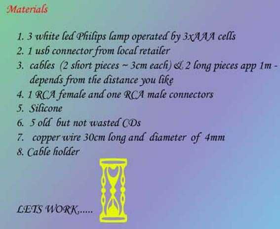 las más difíciles es que el alambre de cobre... en mi país se puede encontrar en ferreterías en piezas de 2m cada uno. Si puedes usar cualquier otra cosa podría estar bien. Sobre el RCA Conector explicaré paso más lejos, por qué los necesitamos pero si no queremos omitir este material también.