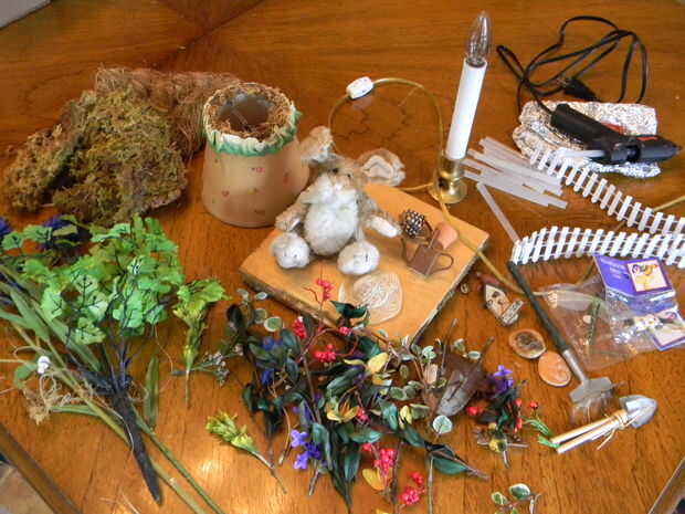 Surtido de miniaturas - cerca (disponible en amazon en http://amzn.to/1s4xnQi), cilindro de rueda, pájaro, libélula, sombrero, mariquitas, cesta, piedras, olla pequeña (que tienen un lindo surtido de miniaturas de jardín en el pasillo de la manía)