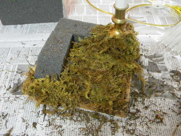 Musgo de pegamento caliente verde que cubre el tablero de madera, bloque y la espuma. No poner demasiado pegamento caliente en la parte superior de la espuma porque puede hacer difícil de meter en los tallos de la flor.