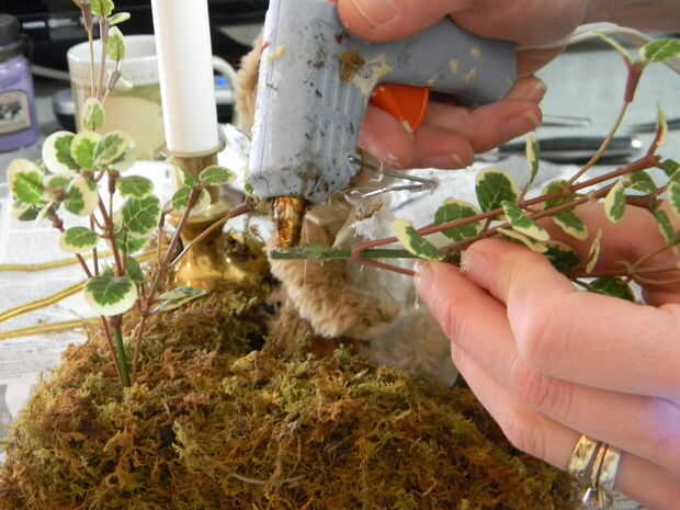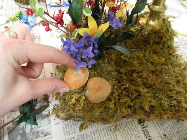 Colocar pegamento sobre la parte inferior de las piezas florales seda y poke en espuma floral. Generalmente empiezo con el verde les espaciado hacia fuera a lo largo de pedazos de espuma y entonces pasemos a las flores. Luego agregar algunas piedras planas en la parte inclinada de la espuma floral.