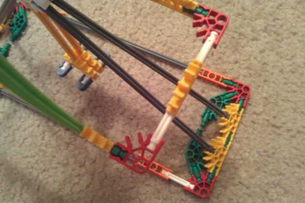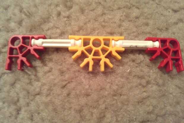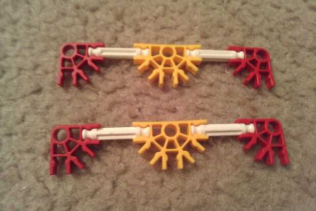 Conectar dos conectores rojo a un conector amarillo con barras blancas. Repita el procedimiento para obtener dos piezas. A continuación, conecte las piezas a los conectores amarillo del paso anterior usando las barras verdes.
