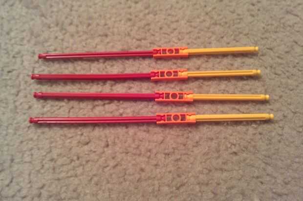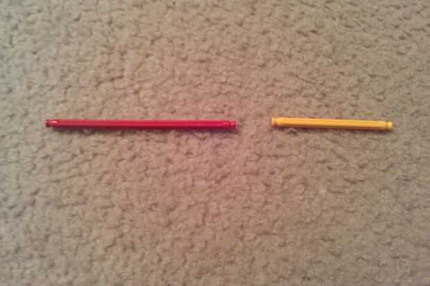 Conectar una barra rojo y una barra amarillo usando un conector naranja. Repita el procedimiento para obtener cuatro pedazos.