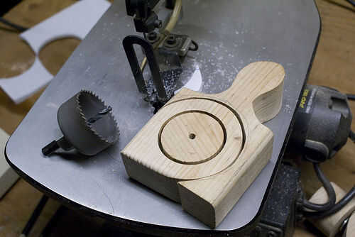 B. bosquejo hacia fuera de la gota de agua su forma alrededor del agujero y cortar con una sierra de contornear.