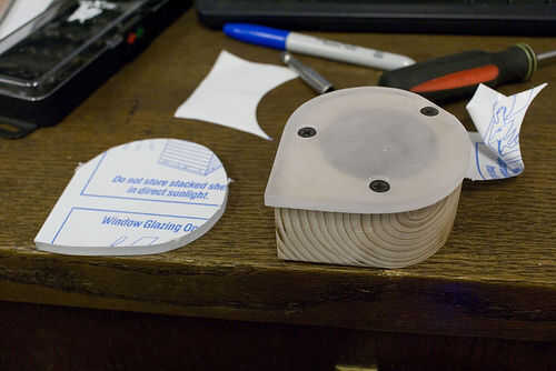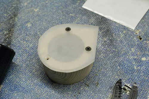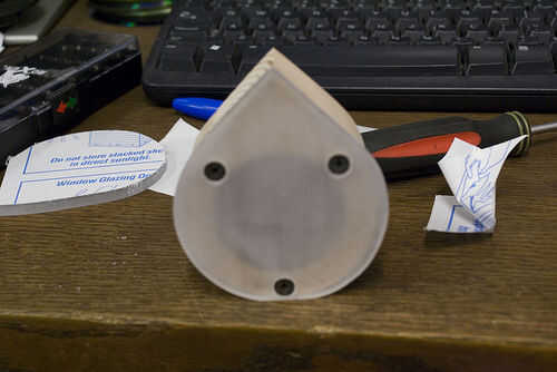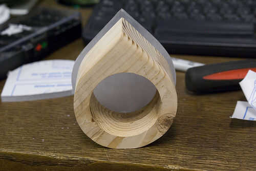 B. ahora concretar la forma de plexiglás y terminar en la lijadora de correa/disco. Lija la parte delantera y trasera para difundir un poco los LEDs.