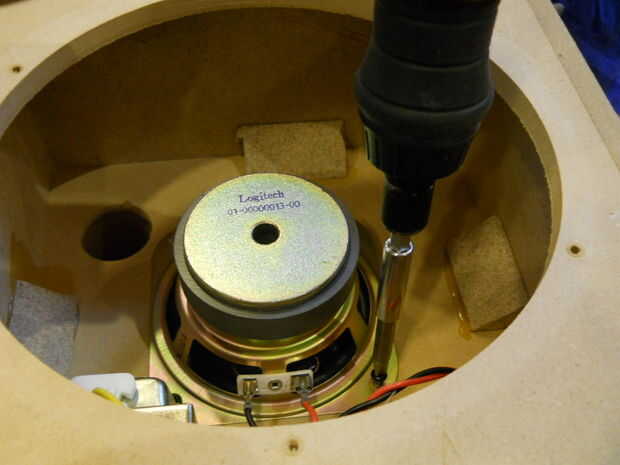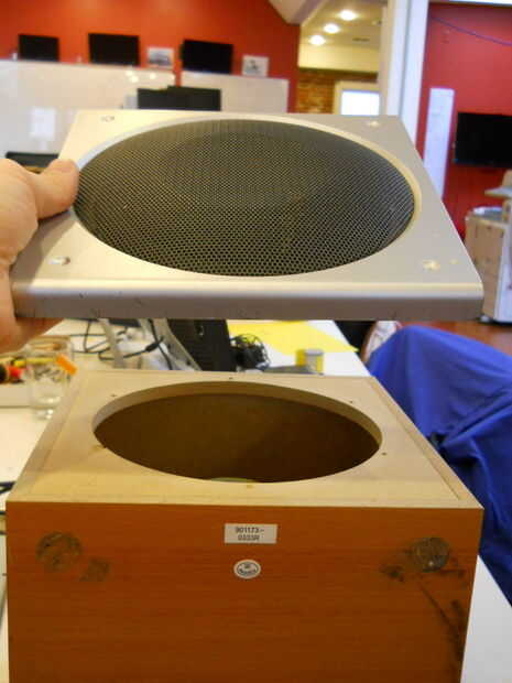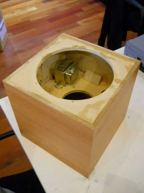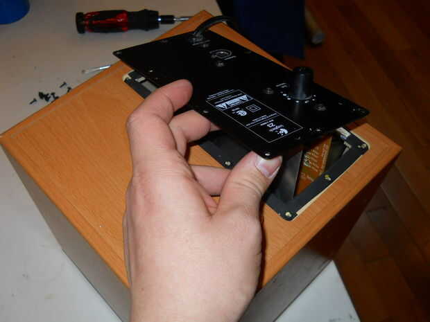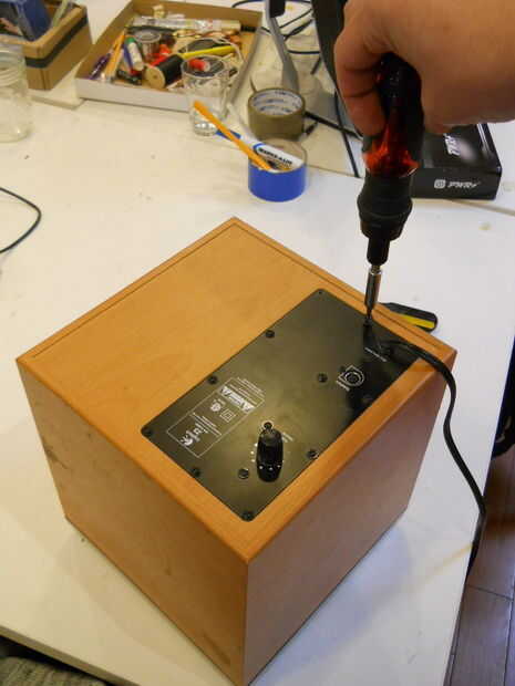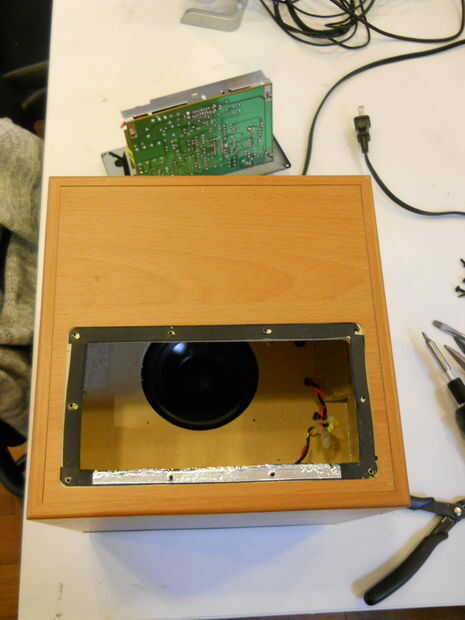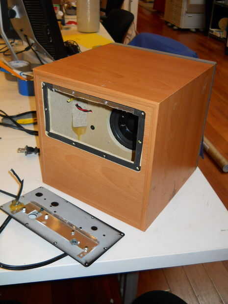 Dismantle the big speaker. Eliminar todo lo interior, dejando la estructura interna de la caja. Mantenga el panel frontal, la trasera y cable de alimentación del orador.