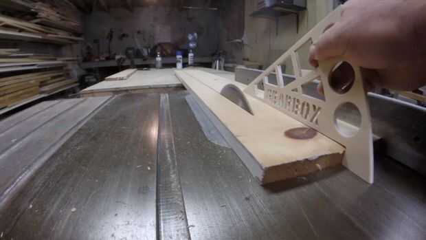 Cortar las piezas para una simple caja de inglete. Corté un profundo surco de 1/8 del ancho de mi hoja 1/4" desde cada borde del tablero en un lado. Esto será el interior de la caja y aceptará el acrílico por ambos lados de la caja. Un lado se utilizará como una puerta de acceso para las luces. Después de cortar todas las piezas, corte a través de la ranura en una de las piezas laterales. Guardar fuera de otoño, esto se utilizará como un tirón de la puerta de acceso.