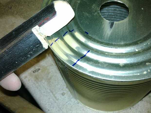 Corte una ranura curva para el borde de la lata para sentarse en por lo que es un ajuste más seguro.