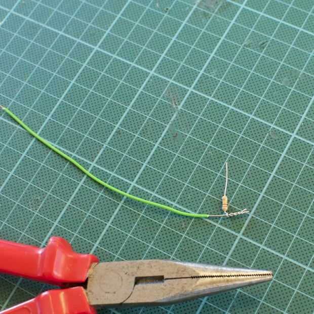 El resistor se fija ahora con un Consejo. La otra punta sobresale, como la antena de una libélula.