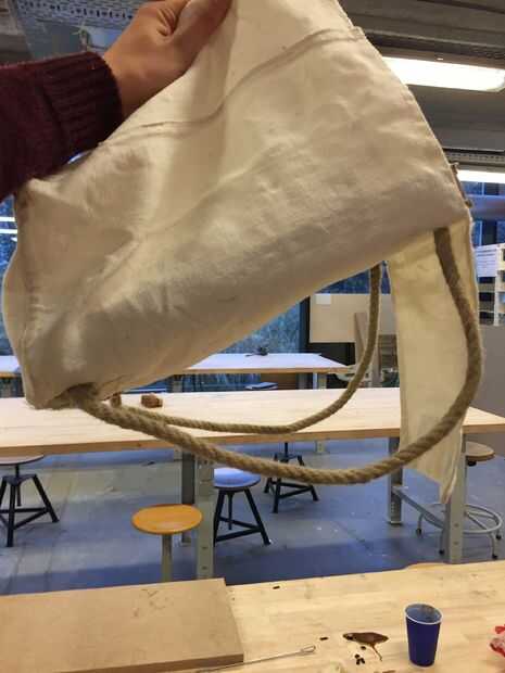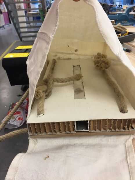 Para fijar el marco a la bolsa y las correas, necesitamos cuerda 2 x 135 cm y dejamos la estructura dentro de la bolsa, hacer un corte justo lo suficientemente grande como para que la cuerda a. Ponemos un extremo en el orificio superior y otro en el orificio inferior y repetir este paso para la otra correa demasiado.