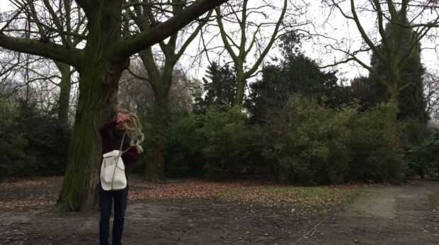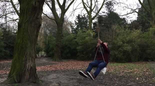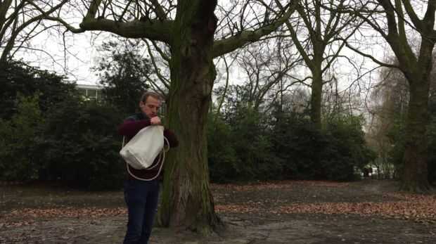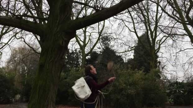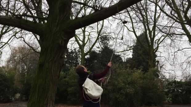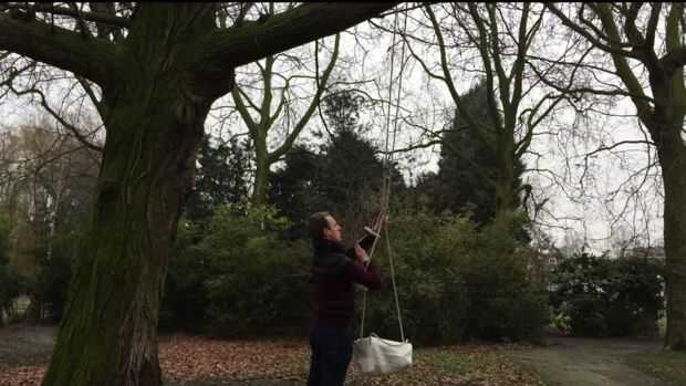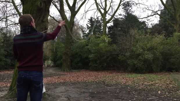 2. Tirar del extremo de la cuerda con la tabla de madera circular unida a él por una rama de árbol.