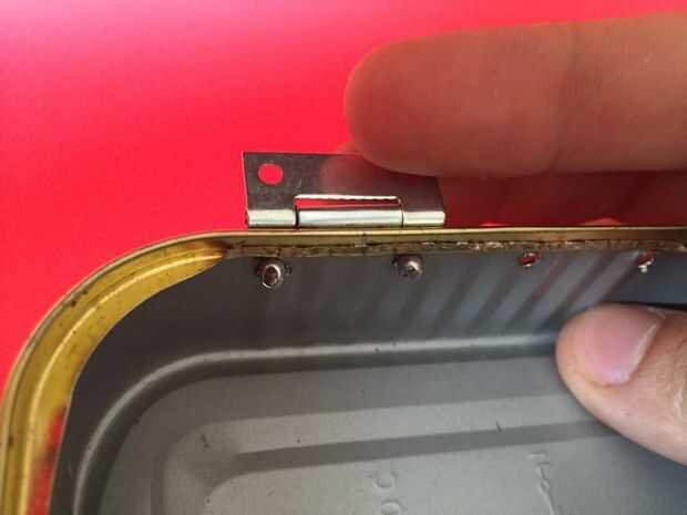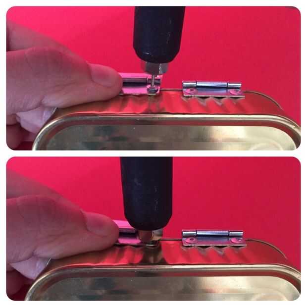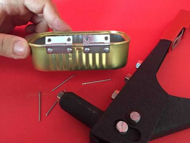 Para fijar las bisagras en las latas de sardina usé remaches pop de aluminio.