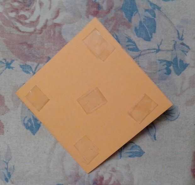 Con cinta de doble cara, pega la tarjeta naranja inclina un poco, encima de la tarjeta de color marrón. Puede utilizar pegamento para esto, pero otra vez, me siento doble cara cinta es más rápido y más limpio.