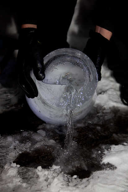 Si la linterna se congelaron correctamente todavía tendrá un montón de agua en el interior y una fina capa de hielo en la parte superior (lo que era la parte inferior de la cubeta). Con cuidado romper un agujero en la parte superior y verter el agua restante para que la linterna es agradable y seco.