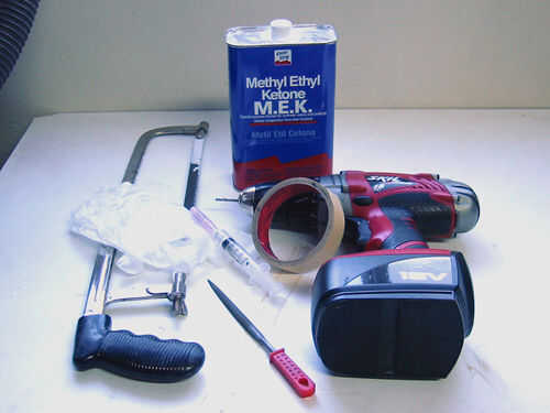 Si se utilizan ABS cemento y pegamento estupendo, no se necesitará la jeringa. Usé MEK y soldar con autógena-en #3 para este proyecto porque ya tuve los dos y enlace más rápido y fácilmente que ABS cemento y pegamento estupendo. Nota importante--apesar de MEK es un bien para proyectos como este, no debe ser utilizado para unir tuberías ABS en aplicaciones de plomería.