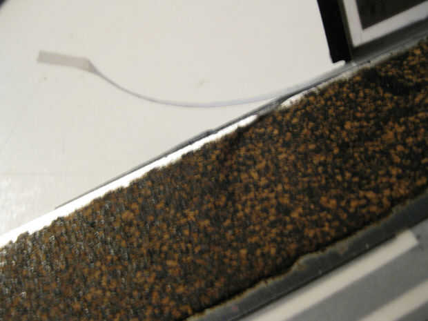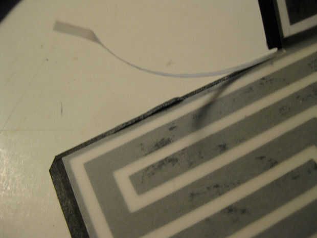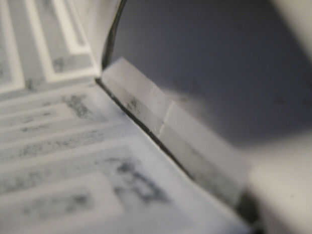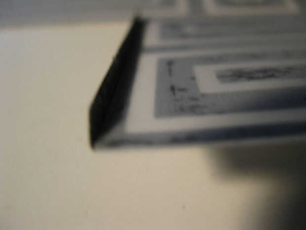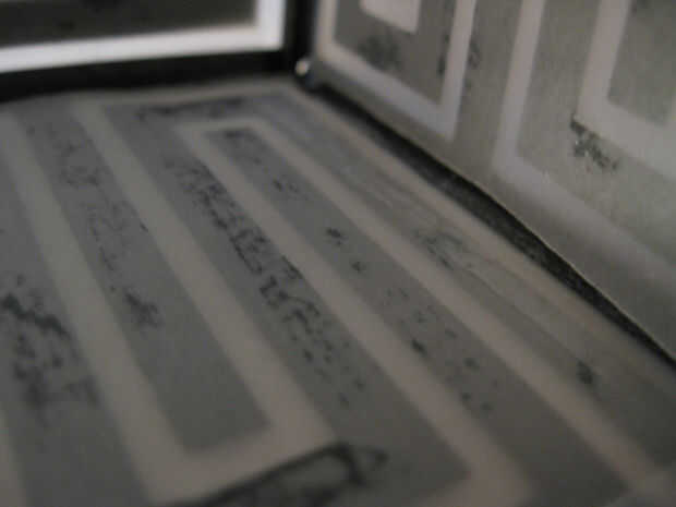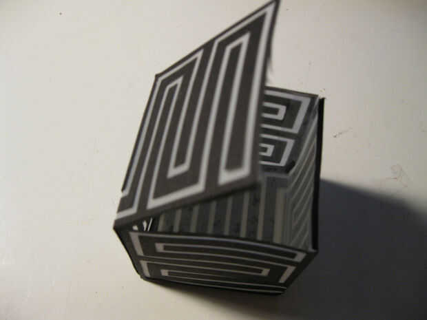 Cuando las piezas estaban secas me los quitan de la pila de revistas. Usé el cuchillo de la manía y la tarjeta de crédito para quitar cuidadosamente las capas de papel de la almohadilla de corte. Puse la pieza hacia fuera plana con el lado de vitela hacia arriba. Se trata de la parte interior del cubo. Utilicé una regla de acero y la tarjeta de crédito a arrugarse los pliegues del cubo y las pestañas. Después de que el cubo estaba arrugado, la vitela colgaba sobre el papel negro en algunos puntos. Usé la regla de acero y el cuchillo de la manía para cortar muy cuidadosamente la vitela sin cortar el papel negro.