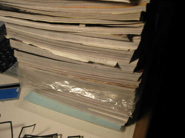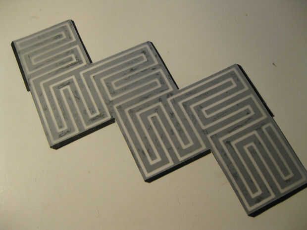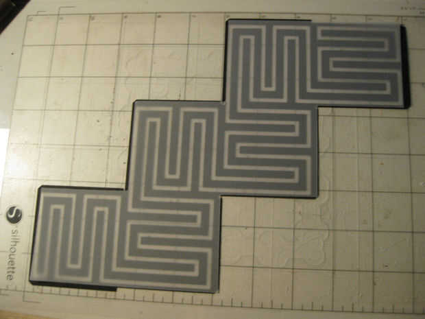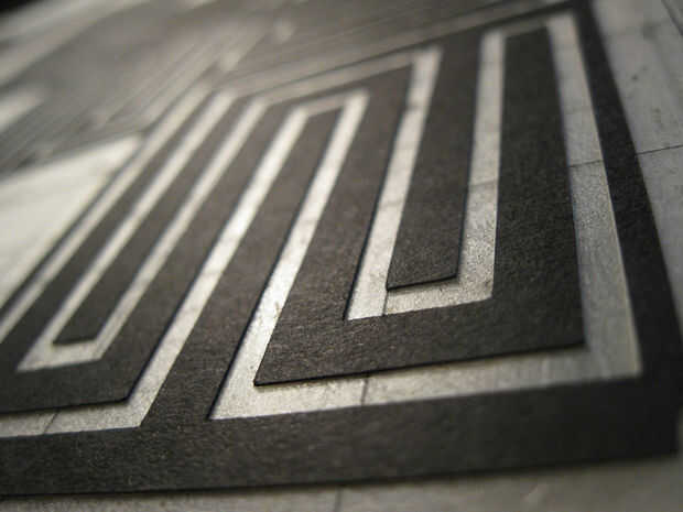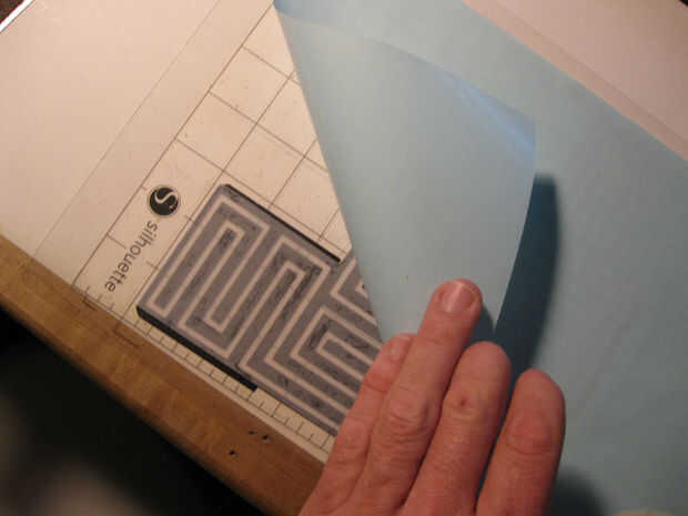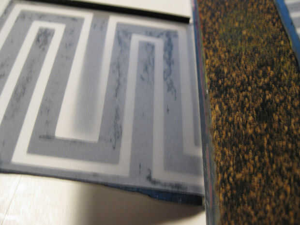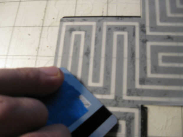 Con dos capas de papel cortarlos era hora para pegarlas. Usé pegamento stick para cubrir cuidadosamente toda la capa negra. Cuidadosamente alineadas la vitela al patrón laberinto negro y alisó hacia abajo con una vieja tarjeta de crédito. A la izquierda las dos capas en la almohadilla de corte y los puso debajo de una pila de revistas que se seque.