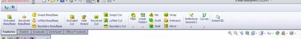 En Solidworks hay cinco barras de herramientas tituladas características, Sketch, evaluar, DimXpert y productos de oficina. Sólo tienes que utilizar las barras de dos herramientas primer, características y dibujo, para el tipo de pieza que estamos haciendo.