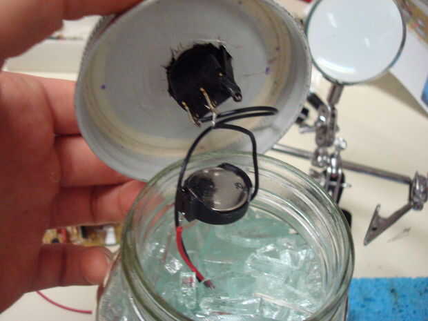 1. eneldo un agujero en la tapa de la jarra para el conmutador. Empezar con poco e ir grandes y tenga cuidado de no rasgar el metal.
