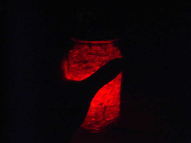 4. fregadero le LED en el vidrio roto. Era más fácil para mí sujetarlo con una pinza y luego llenar la jarra.