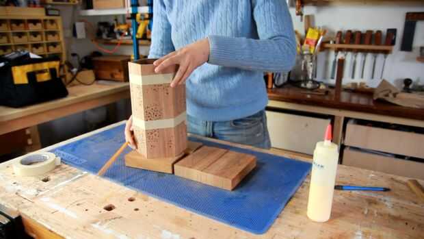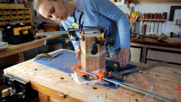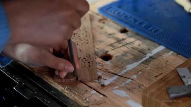 En uno de los lados necesito material removido para colocar un interruptor pequeño, así que marcar hacia fuera, cortar hacia el lado y utilizando un cincel para eliminar la madera. A continuación estoy marcando donde deben ir los agujeros y sólo algunos agujeros pequeños. También perforé un agujero en el lado de la clavija.