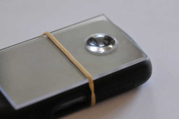 1. Desatornille el "fin del negocio" de una seguridad de bajo costo puerta viendo el lente.2. fijarla (temporalmente) sobre la lente de la cámara del teléfono. Por suerte mía fue un firme pon en la caja de goma, pero Blu-Tack® o similar habría h