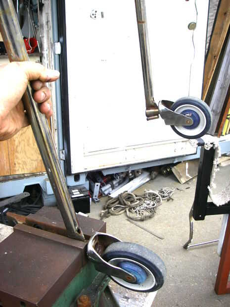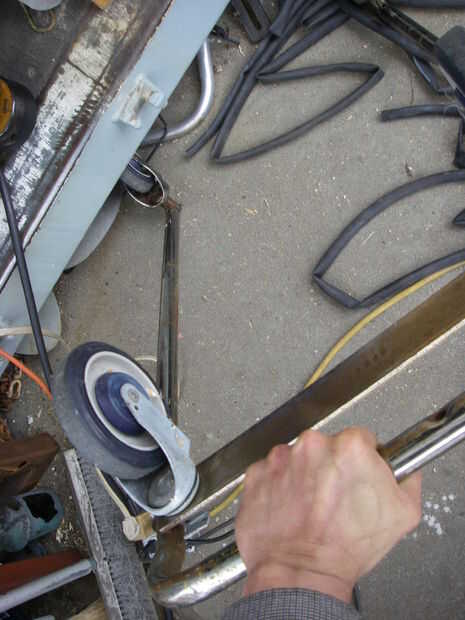 Exprimir el marco hace que las ruedas no paralelo más. Estas ruedas estaban decididas ya fuera de línea por el tren que golpearlo. Utilizar un tornillo de banco y la brecha en el contenedor de envío para doblar las ruedas recto otra vez.