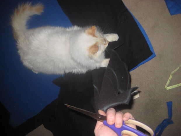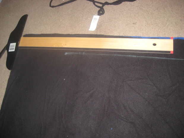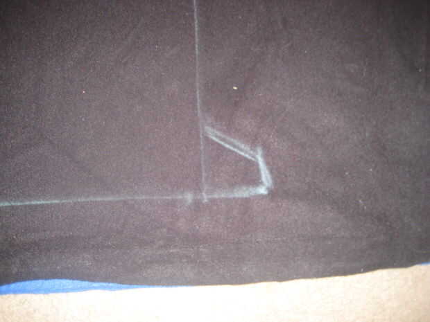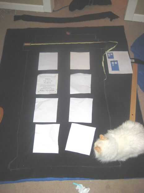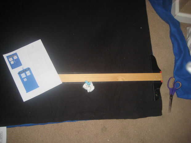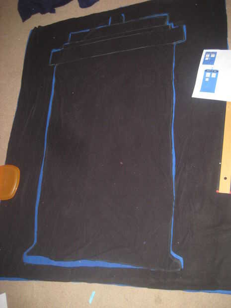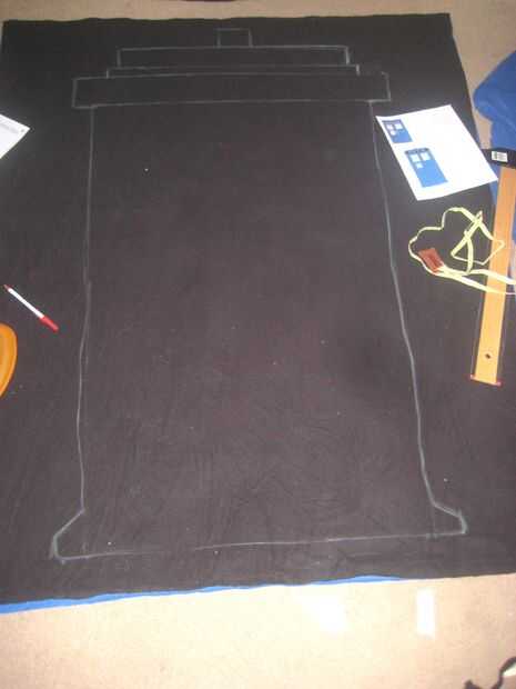 Ahora tome la tiza de marcar y marcar el exterior del Tardis en el vellón negro – Asegúrese de envolver la tiza en una toalla de papel para limpiar los dedos. Use la T cuadrada o recta para asegurarse de que sus líneas son rectas por lo que su Tardis no parece desproporcionado. Después de que tuviera el contorno dibujado, usé patrones de papel para averiguar el tamaño de las plazas, puso hacia fuera para asegurarse de que todo parecía correcto.