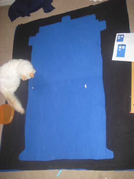 Recortar el contorno de la Tardis de polar negro. Tomar el vellón negro sólo cortar y cortar una tira que es 3 "x 30" señal de donde va la "policía pública llamada caja".