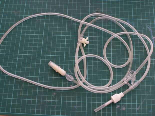 - 30 cm de tubo, diámetro exterior 5-10 mm. Utilicé el tubo de una bolsa de infusión (preguntar al farmacéutico, lo tengo gratis). Tubo de acuario está bien también. En la tienda de mascotas, $2,-