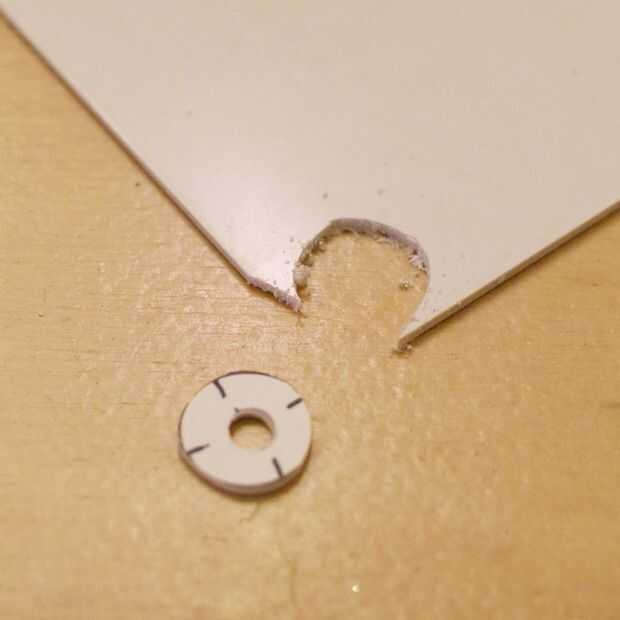 - Dar el tubo de una brida. Corte un círculo (ø 15 mm) de una hoja del ABS y perforó un agujero de 4.8 mm en él. La brida se pega al tubo con pegamento.