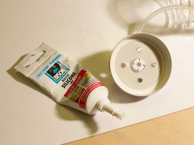 - Poner una buena capa de kit de silicona sobre la brida y pegar el otro extremo del tubo a través del orificio correspondiente en el casquillo.