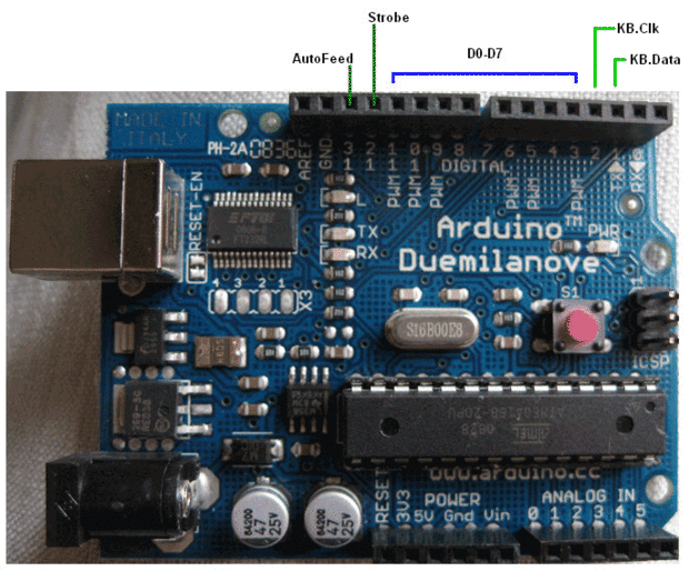 La idea es conectar el teclado a la impresora con un interfaz simple y económico, he usado Arduino porque es una placa de desarrollo rápido para este tipo de proyectos y tiene una gran comunidad detrás. La Junta Lea las señales del teclado (uso de un sistema de reloj de datos) y transforma esta información sobre el carácter a la impresora. Formato paralelo control de la luz estroboscópica.