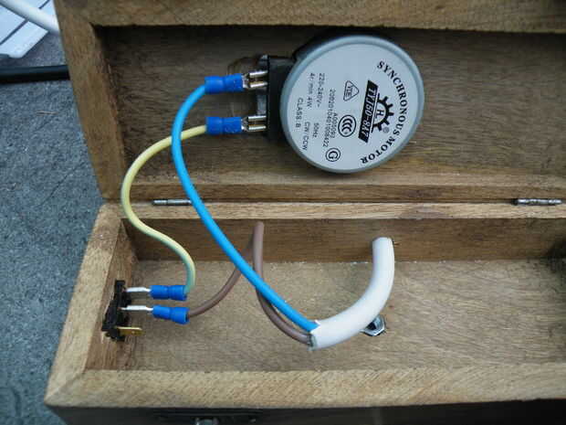 Sólo cortan las tomas, rosca el cable a través de un orificio perforado en la parte posterior de la caja (a medio camino a lo largo, para el equilibrio) y conectado el motor y el interruptor con las cosas de conector de pala plana.