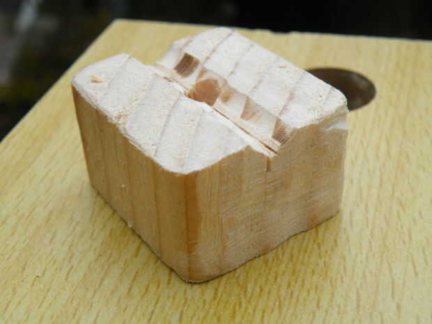 Para agregar el brazo que va a hacer el trabajo, cortar un bloque de madera de desecho. Taladré un agujero vertical de acople y pegamento caliente en el eje y una muesca en la parte superior para poner la clavija en.