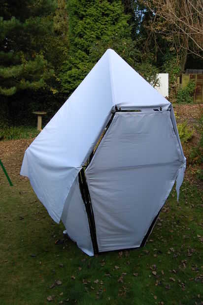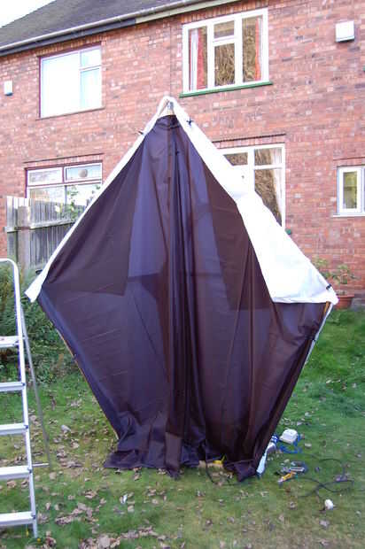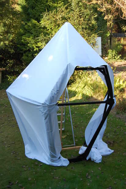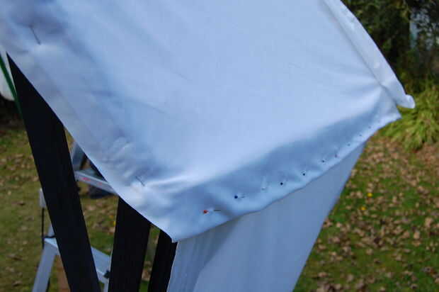 El marco está cubierto de blanco, tela de la guarnición. Quería algo que era opaco, pero todavía permitiría que la luz brille a través de él. Esta primera foto muestra la tela se arrojó sobre el marco para hacerse una idea de cómo podría ser. Yo también estaba jugando con la idea de una cubierta de una sola pieza... No... demasiado complicado!
