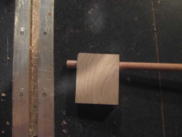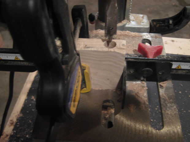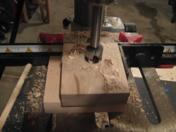 Una vez que el agujero ha sido perforado, cambiar pedacitos al que necesitará para el taco más grande (en mi caso 3/4" pieza Forstner) y taladrar con la cara de la culata. No quieres hacer derecho en la línea de testigo, porque es contra los estatutos de la Asociación de su propietario. En cambio, taladro de 1/4" de la línea. Derecho a través de la broca. Es importante que este agujero sea perpendicular a la cara. Si no es así, el indicador funcionará un poco gracioso, que puede ser un capricho que estés dispuesto a afrontar, pero realmente esto no debería tomar mucho sobre la.
