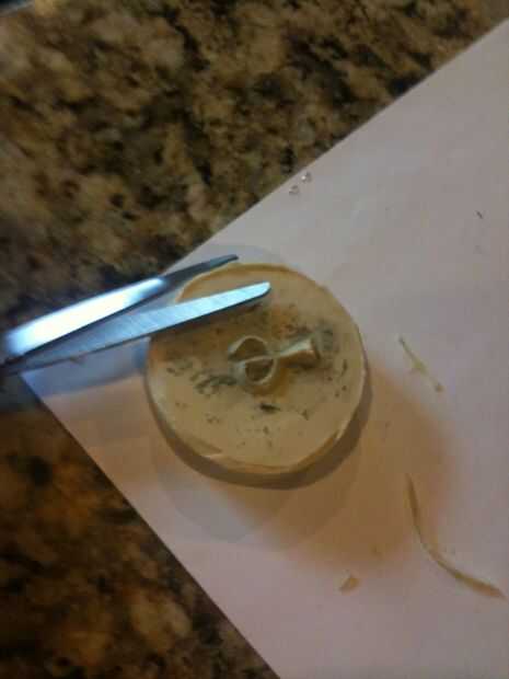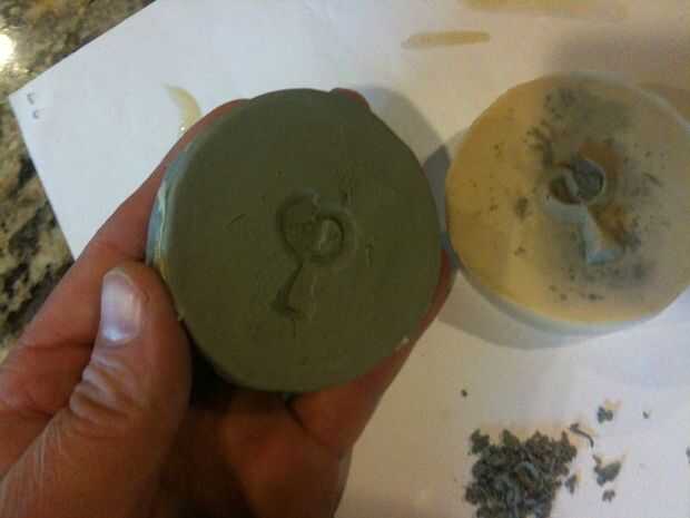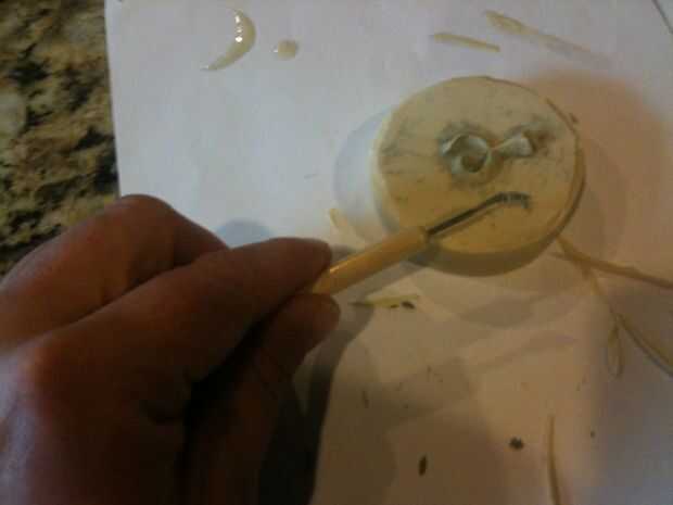 Cuando la resina ha establecido para la consistencia de goma firme pero no completamente duro es el momento de desmoldar. Comenzar por pelar la cinta del conducto. Luego solucionar el molde aflojar los bordes. Cuando usted tiene el borde suelto todo lentamente Levante se aparte hasta que aparece suelta. A continuación, mientras que la resina es de uso todavía goma tijeras para recortar el borde del borde. Ahora deje que la resina endurezca el resto del camino, alrededor de una hora. Después de que sea completamente endurecido Limpie la arcilla residual.