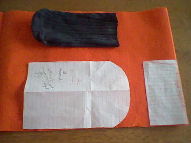 lista de materiales:Una cinta negraUna o más hojas de negro arte espumaUn calcetín de vestido negroFieltro blanco y negro con botones blancosAlgún tipo de botella o envase redondo para envolver su calcetín sobreY por supuesto... caliente pistola de p