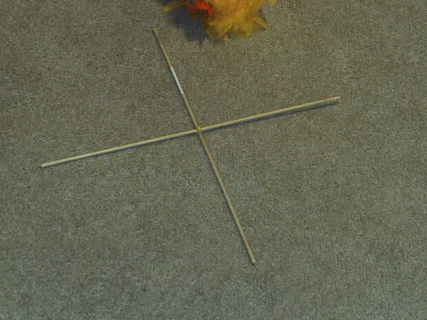 Hacer una pequeña muesca en el centro de cada clavija y cruzar los tacos. Las muescas evitará que moverse. (También martillado una tachuela en el centro y caliente pegué a la muerte).