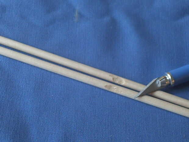 Corte una muesca en el extremo de cada pasador. La madera puede dividir, así que ten cuidado. Si lo hace, usted puede poner un pedazo de cinta alrededor de ella para sostener juntos.